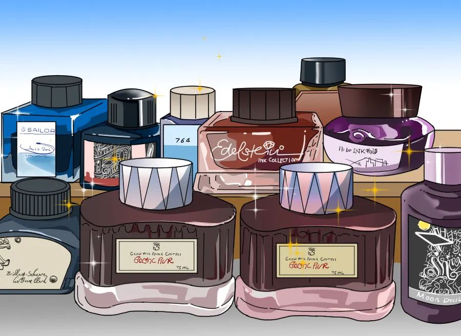 每毫升彩墨的单价约为0.5-5元,一小瓶的价格就要几十元到几百元不等,这些彩墨通常会起一些类似蝉时雨、西府海棠、苍山覆雪、幽山向晚这类满是氛围感却让人很难想象究竟是什么颜色的名字。就连墨水瓶也有着追赶大牌香水瓶一样的精致设计。